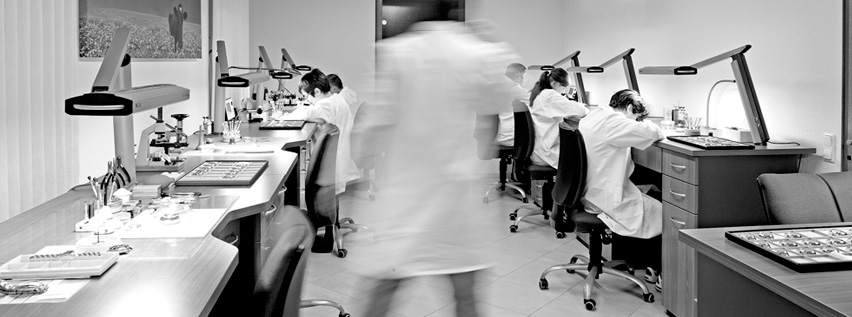 Behutsame Hände der Uhrmacher unter den scharfen Augen des Werkstattleiters. Preisgekröntes Handwerk. Montage, Service, Pflege bei Bedarf auch Reparatur. Gangschein ausgestellt und raus in die Welt. Ein hübsches Stück Zeit. Die perfekte Symbiose aus Zeitgeist und Tradition.