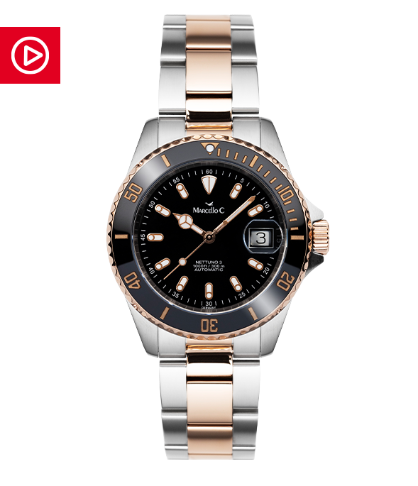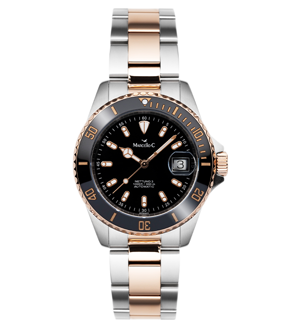 schwarz mit aufgesetzten Indizes PVD-Rosé beschichtet, Leuchtmasse Superluminova Grade X1 weiß auf Indizes und Zeiger