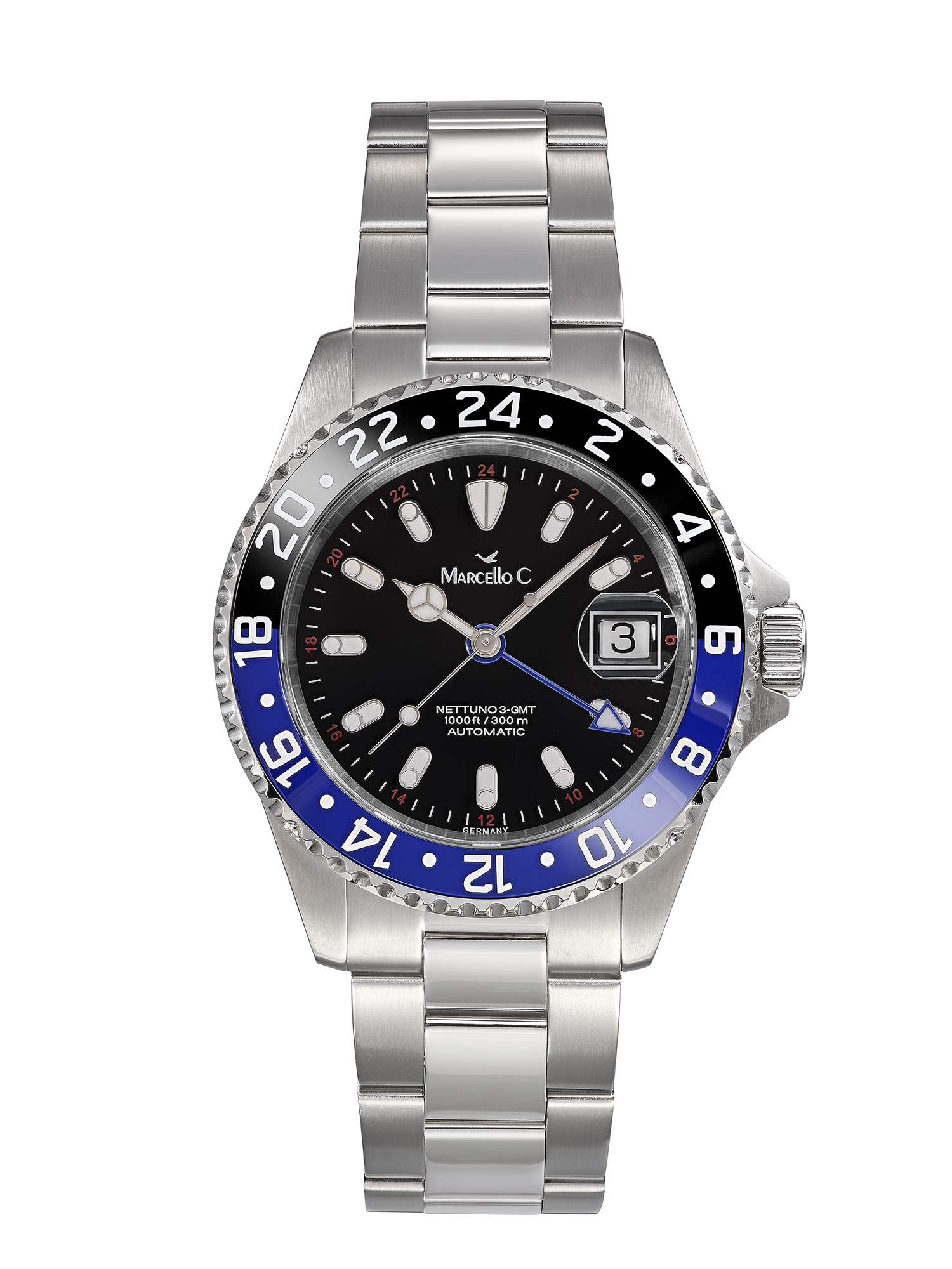 schwarz mit aufgesetzten Indeces und 24 Stunden Anzeige,